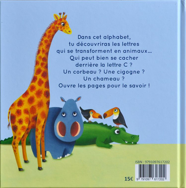 Dans cet alphabet, tu découvriras les lettres qui se transforment en animaux...Qui peut bien se cacher derrière la lettre C ? Un Corbeau ? Une Cigogne ? Un Chameau ? Ouvre les pages pour le savoir !