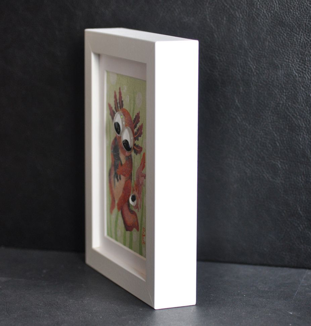 Peinture à l'huile format 10x15cm encadrée dans un cadre en bois blanc 13x18cm. Des petits galets de verre appelés également "billes chinoises" ont été collés sur les yeux, pour donner un aspect ludique et vivant, en produisant un effet loupe particulièrement apprécié des petits et grands enfants !
