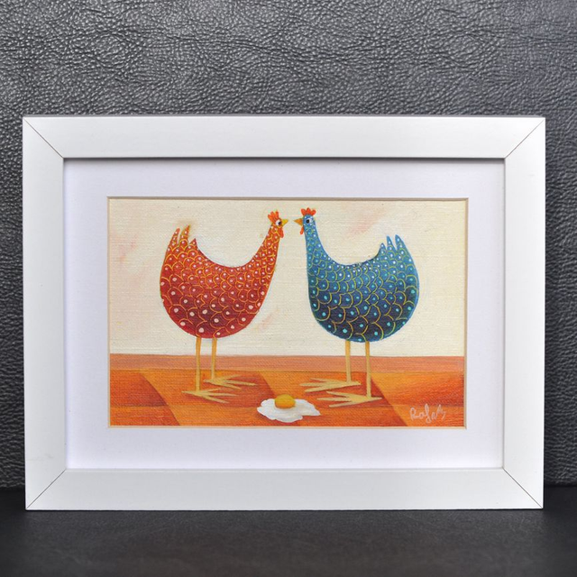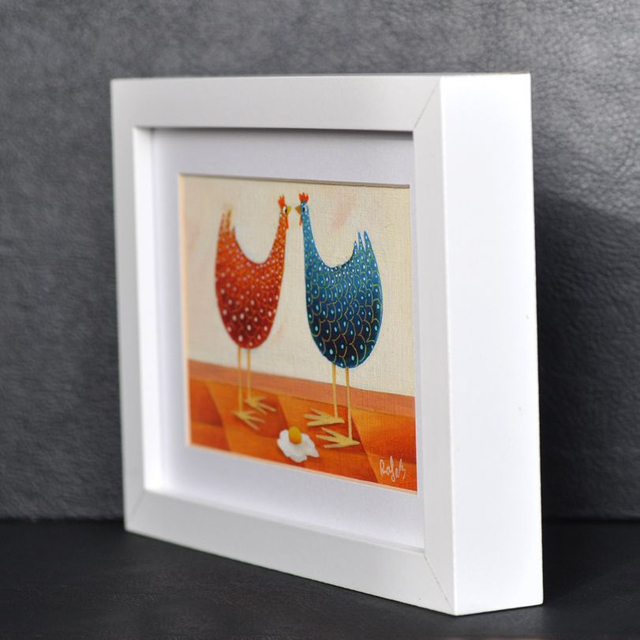 Peinture à l'huile format 10x15cm encadrée dans un cadre en bois blanc 13x18cm. Des petits galets de verre appelés également "billes chinoises" ont été collés sur les yeux, pour donner un aspect ludique et vivant, en produisant un effet loupe particulièrement apprécié des petits et grands enfants !