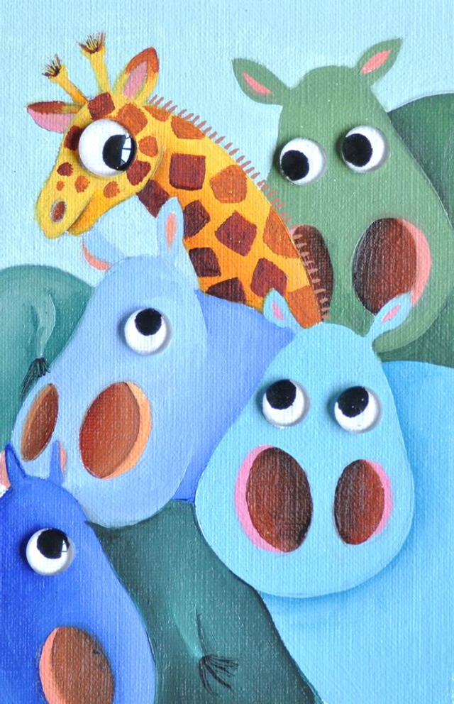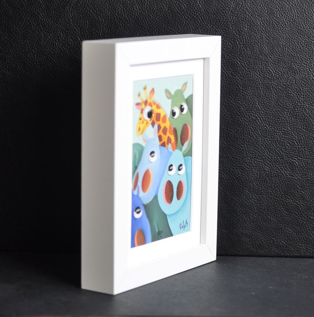 Peinture à l'huile format 10x15cm encadrée dans un cadre en bois blanc 13x18cm. Des petits galets de verre appelés également "billes chinoises" ont été collés sur les yeux, pour donner un aspect ludique et vivant, en produisant un effet loupe particulièrement apprécié des petits et grands enfants !