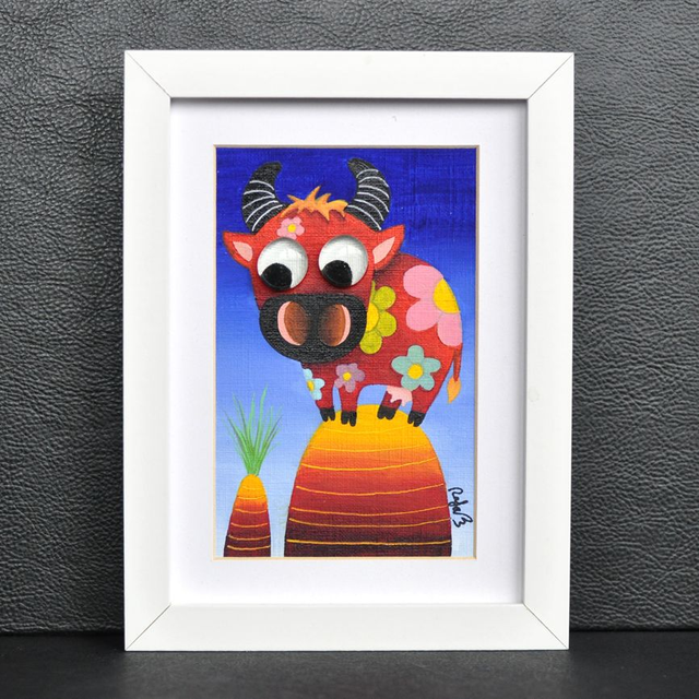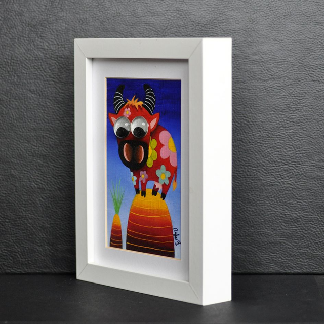 Peinture à l'huile format 10x15cm encadrée dans un cadre en bois blanc 13x18cm. Des petits galets de verre appelés également "billes chinoises" ont été collés sur les yeux, pour donner un aspect ludique et vivant, en produisant un effet loupe particulièrement apprécié des petits et grands enfants !