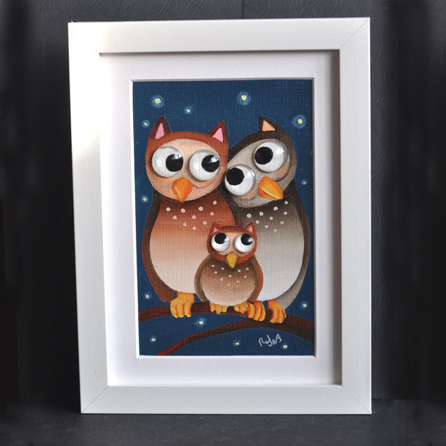 Peinture à l'huile format 10x15cm encadrée dans un cadre en bois blanc 13x18cm. Des petits galets de verre appelés également "billes chinoises" ont été collés sur les yeux, pour donner un aspect ludique et vivant, en produisant un effet loupe particulièrement apprécié des petits et grands enfants !