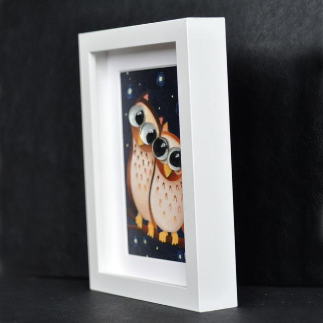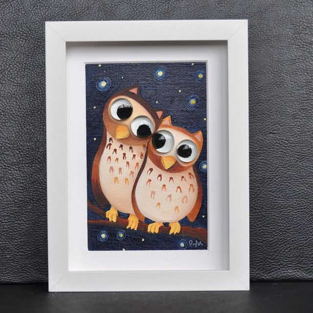 Peinture à l'huile format 10x15cm encadrée dans un cadre en bois blanc 13x18cm. Des petits galets de verre appelés également "billes chinoises" ont été collés sur les yeux, pour donner un aspect ludique et vivant, en produisant un effet loupe particulièrement apprécié des petits et grands enfants !